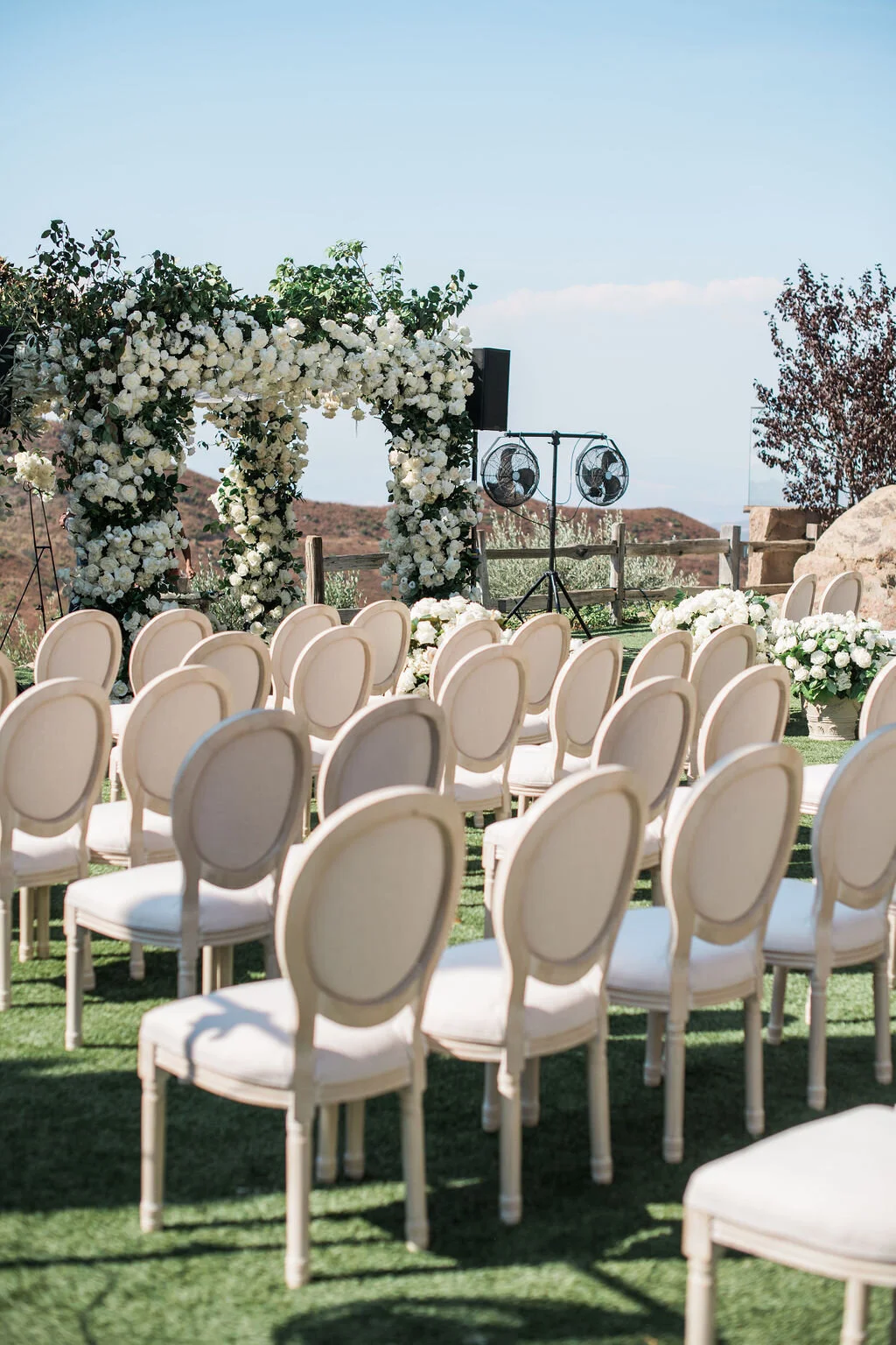 What started off as a 450 person Beverly Hills indoor glamour Ballroom wedding turned into a soft sophisticated farm wedding in the heart of Malibu Canyons for 90. Michelle and Mehrdad changed wedding dates several times and landed on the hottest day of 2020. But Labor day weekend was perfect for Covid as high temps were in our guests favor. We started off the wedding at Cielo Farms with a lush chuppah made of white and cream blooms with soft flowy greenery which helped shade the couple and family during the ceremony. A last minute add on of water misters surrounded the guest seating, while Marks Garden brought in plenty of extra floral to replace any wilted flowers. Hydrangeas drink lots of water and once sun hits it, it is literally cooked. Guests moved across the street to Saddlerock Ranch where we transformed their lawn with wood flooring and white carpet to create the white cloudy foundation Michelle dreamed. Her overall design started with the pale wood upholstered round back chairs from Premiere Party. They were the perfect color and style to set the tone for the rest of the reception. We added a multi level truss structure with crystal chandeliers to frame the Sweetheart table. When you are in the middle of a field, we had had to create a focal point or else the table gets lost. The added blooms and greenery hid our fabric liner and components. When adding anything heavy and metal based, its never pretty unless cover it up properly. Subtle accents of gold and creamy ceramic plates added texture to the tables. Because a traditional Persian sweets table was not acceptable during Covid, we ordered individual acrylic boxed treats for guests to enjoy or take home. I especially loved the hand painted details on the macarons.