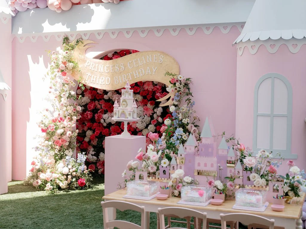 Guests stepped into a storybook at Celine’s princess castle themed third birthday. This rooftop was transformed beautifully with the help of a custom built pink castle adorned with a scroll-like sign for Princess Celine. Behind this sign was a wall with an abundant amount of florals that made you feel like a princess. The castle was surrounded with pastel balloon arcs that added to the fairytale. The kids activity table featured a castle cutout, custom clear acrylic boxes with a tiara and other goodies, and a coloring book with crayons. The kids also enjoyed sliding into a ball pit with all their friends after they finished coloring. The centerpiece was the grand castle cake, adorned with towers, turrets, and royal embellishments. This magical day had everyone leaving feeling like noble guests from a fairy tale kingdom.